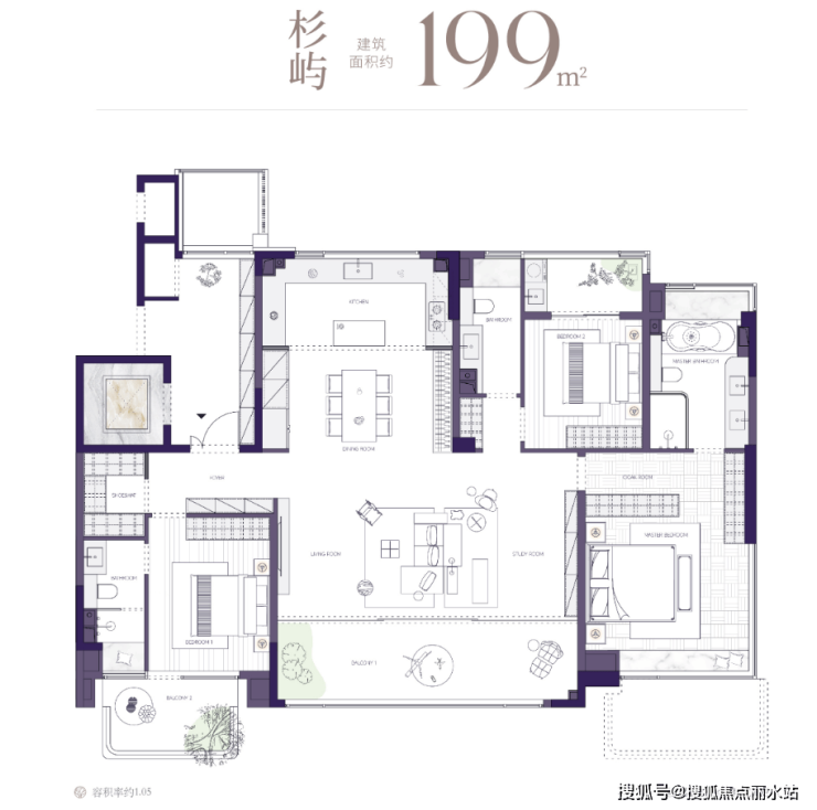 建面约199㎡,我们看到的这套示意图为三室两厅三卫,户户空中花园,南北双阳台,南向双套房设计,270°观景视角,8.1米超大横厅。