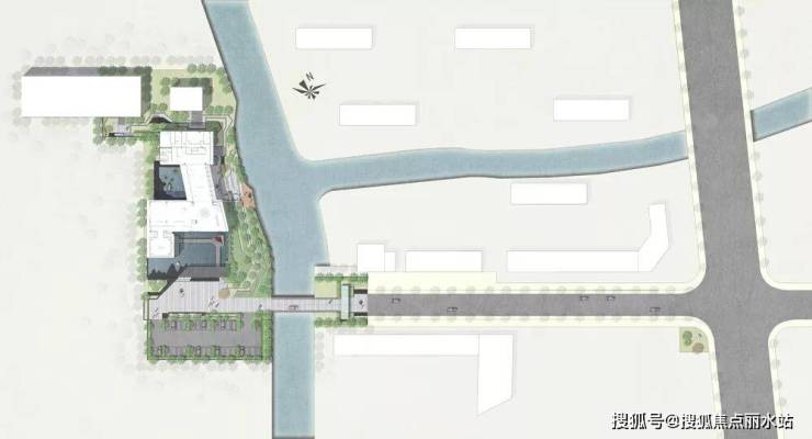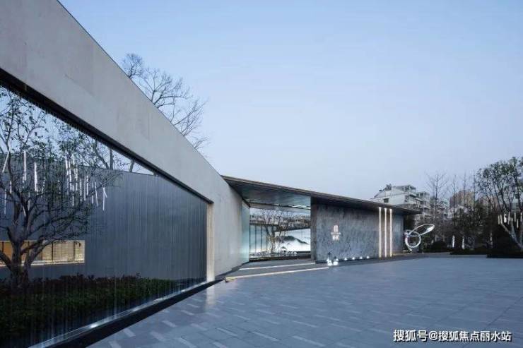 穿过大型玻璃构筑,走进前场。门楼前开阔的广场,昭示了元垄·华著“现代化、城市化”高端楼盘的定位。穿过西周直江上的景桥,即可看见景观水帘,水流淅淅沥沥地流淌,灵动悦耳,与简约的门楼相互映衬。踏上台阶,超大水面映入眼帘,水中倒映着简约现代、充满绍兴特色的销售中心建筑。