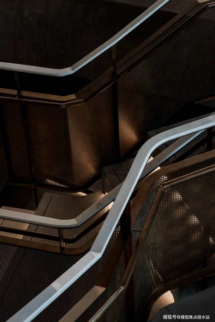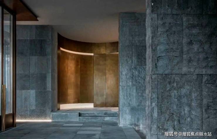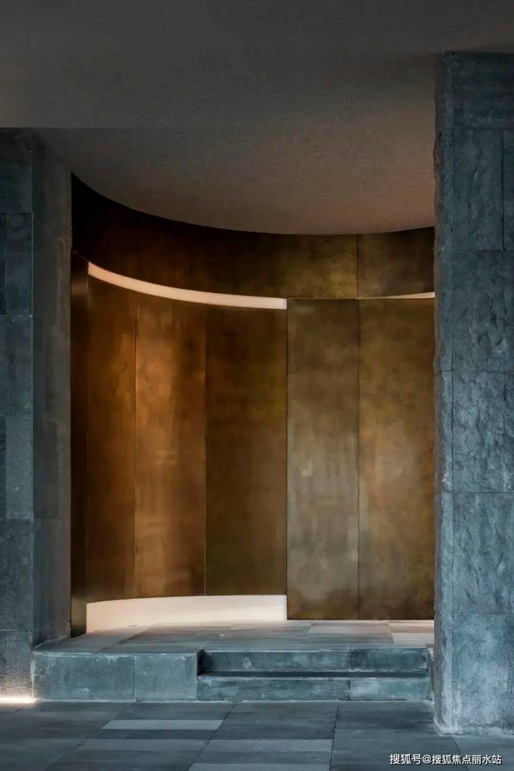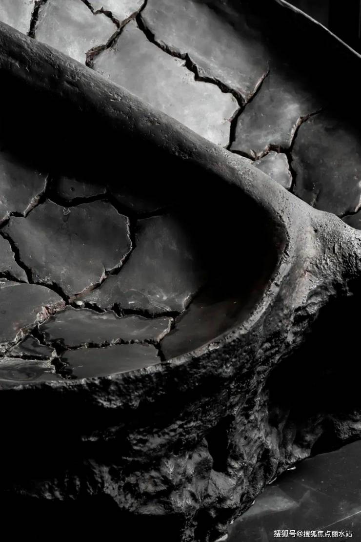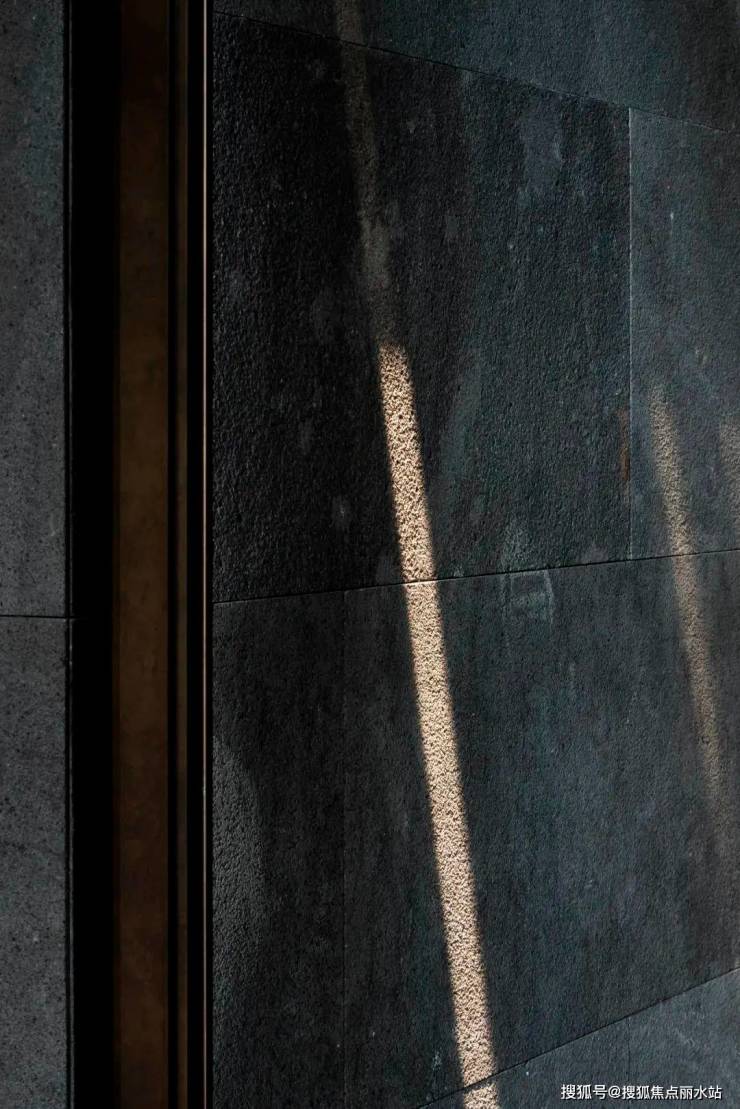 一座城,与山林相伴,闲时树下乘荫漫谈,有避世之感,我们希望将这种氛围延续至空间。因此在室内材质上选择深灰色的沉积岩——它横跨时间,在流行之外,表面的工艺稚拙,带有硬度较高的浅色沉积层,形成类似泼墨的斑纹,我们希望将其与涂山窑的陶板做结合,由物质性的本身出发,推导出空间的形态。