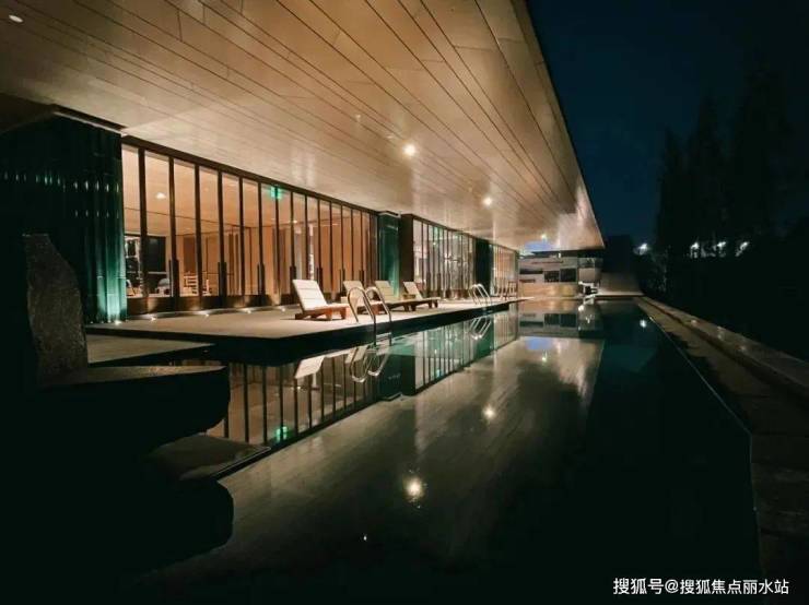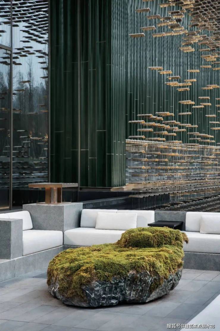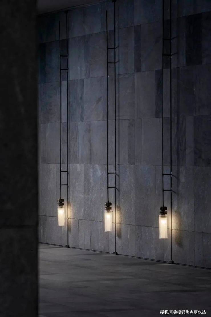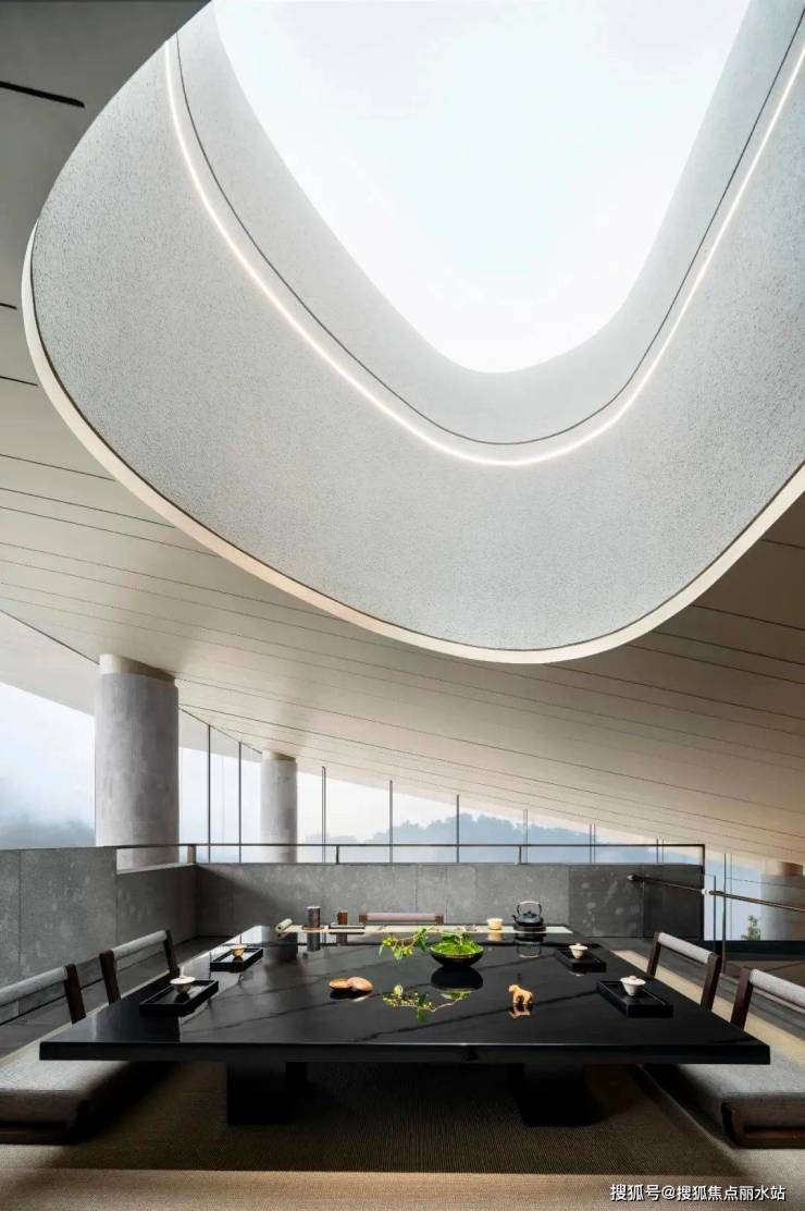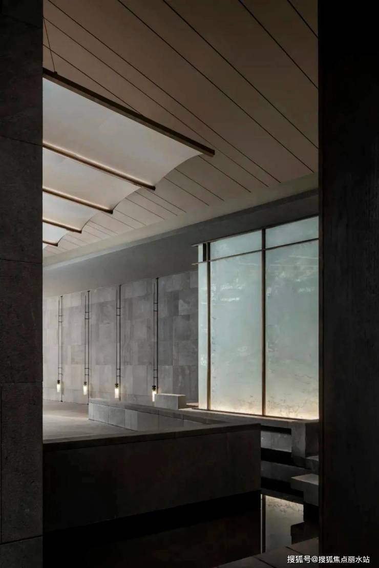从进入会所开始,我们就营造了一种松弛的度假氛围:酒店式的接待台、拙朴的沉积岩空间肌理、松弛的脚感、幽弱的暖光,空间被压在一个温暖的阴翳的调子里,转身进入主空间后,豁然开朗,空间轴线特意做了偏转,以松动的状态长在水面上,巨大的纸面顶棚装置静置在上空,似高古的风筝,静谧,却当风。