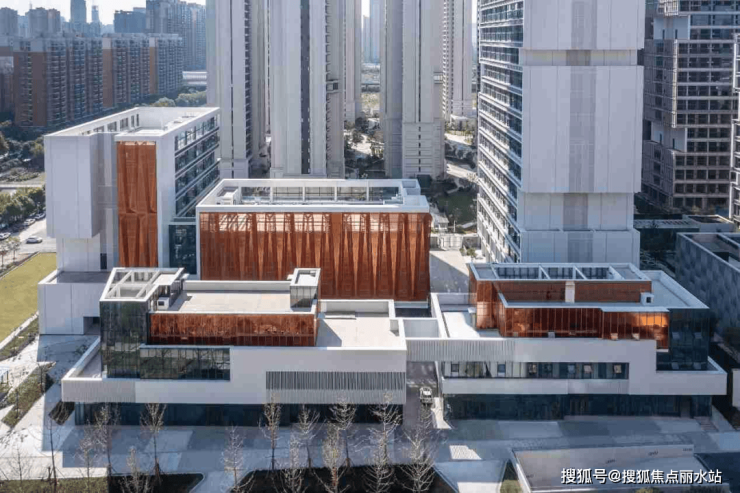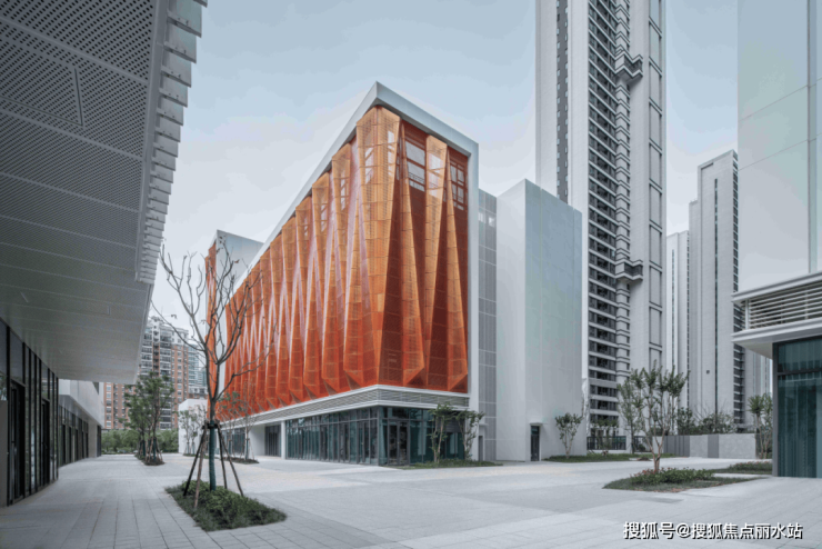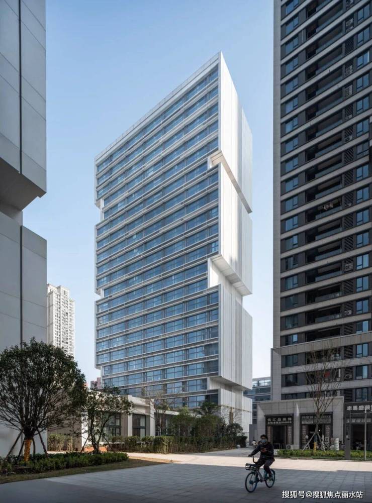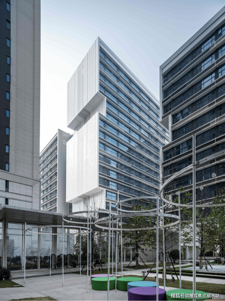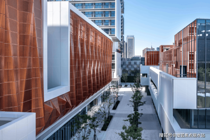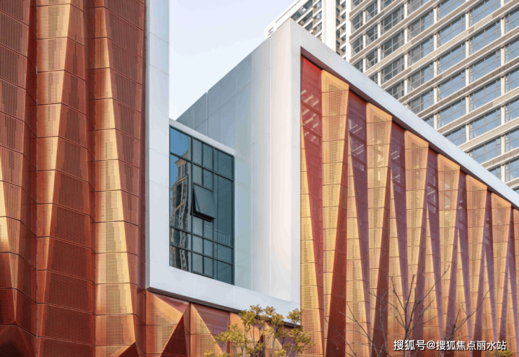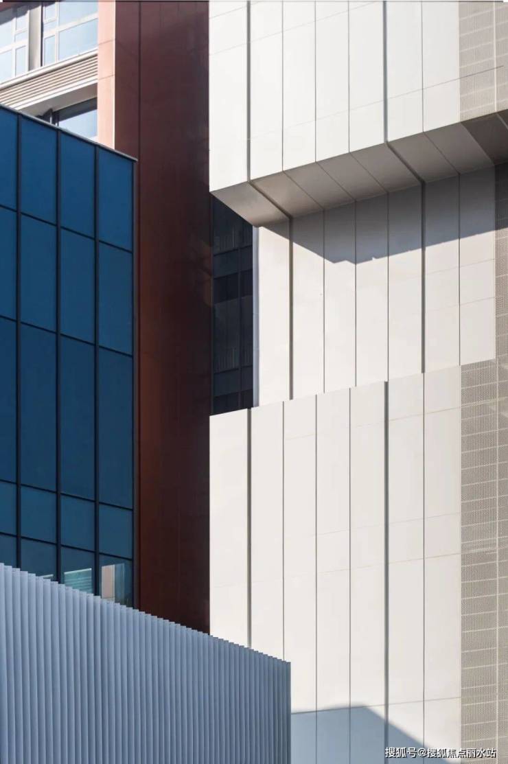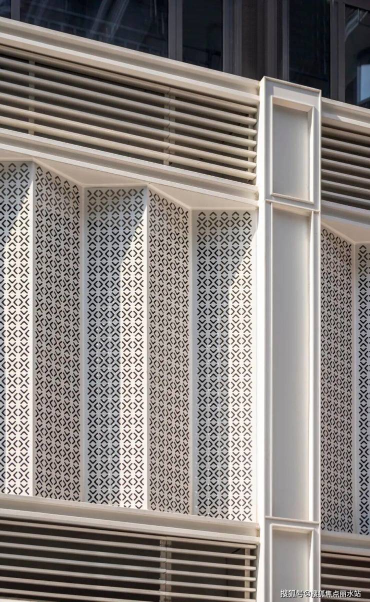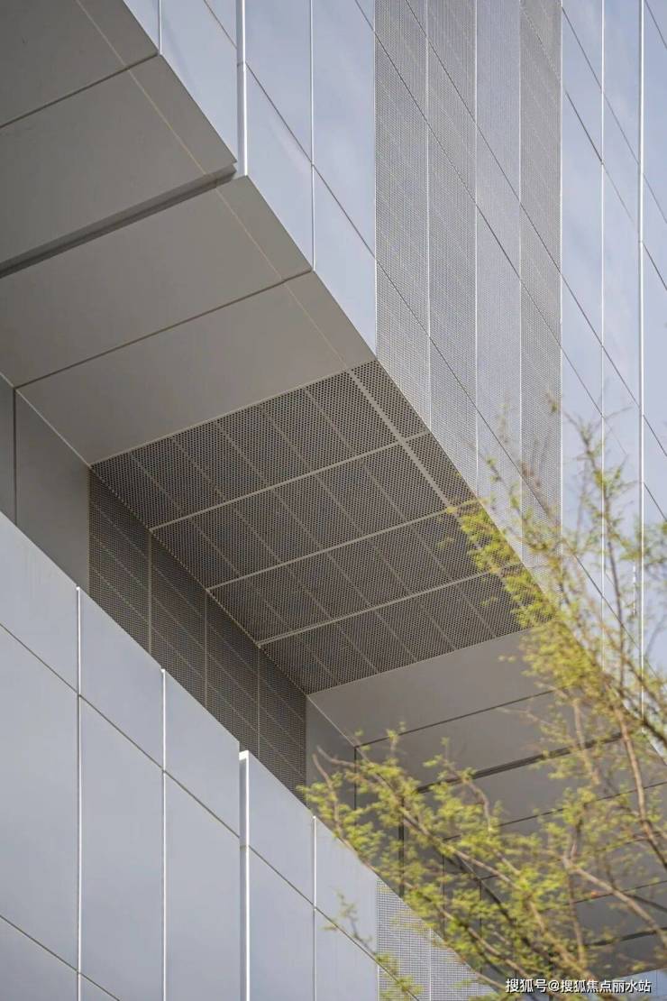 本项目中大量应用常规材料,形成非常规的表皮形式,在周边城市中形成自身的标识感。多孔材料的应用,不仅在室内空间形成丰富的光影变化,在室外角度,会随着视线角度形成不透明、半透明的多种状态,折叠形成的阴影面,展现建筑的现代感和挺拔感。铝板与玻璃的结合、铝板与穿孔板的结合,通过多种材质的碰撞,控制各材质的比例关系,使得形体的沉稳与轻盈之间达成平衡。