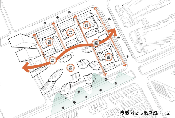 ·合理规划:根据商业特性,沿街布置商业组团,结合商业分散布置办公组团,利用商业组团将各组团进行划分串联,使得各组团之间相互渗透,形成完整连续的慢行系统,住宅组团则集中布置在地块内部空间。
