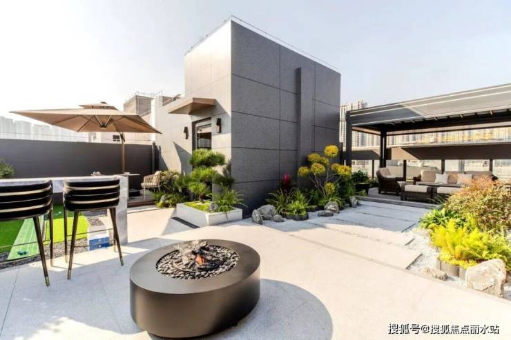 顶层大露台,木色与米色色调相拥的氛围感,桌椅、绿植与阳光共舞,规划阳光花房、园林景观吧台与高尔夫练习区,在这里闲谈、待客、休憩,一杯咖啡或是一杆球,让商务洽谈与圈层社交自然发生,为生意与资产持续增值。