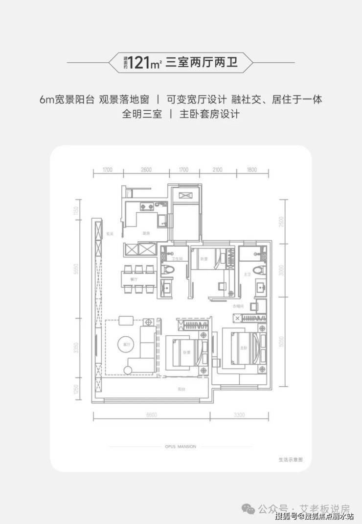 优点:6.6米联通阳台,而且是大落地窗,通体玻璃,采光好,视野通透。还做了可变宽厅的设计,把客厅和卧室的墙体去掉,就是宽厅两居的设计。