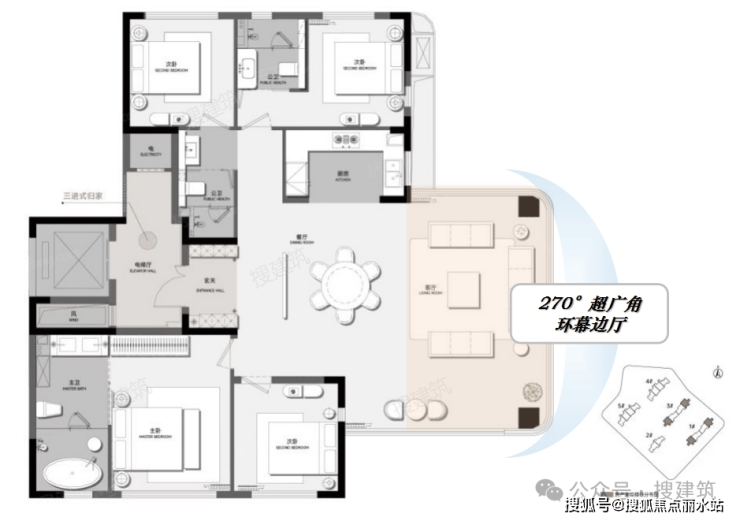 利用三面采光特性,使客厅、主卧等核心区域实现270°采光覆盖;