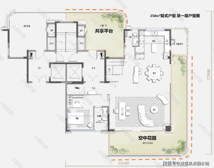 其中258户型,是难得的四代宅+复式的设计,餐客厅约6.5米挑空,还打造了三面环景的空中花园阳台和共享平台