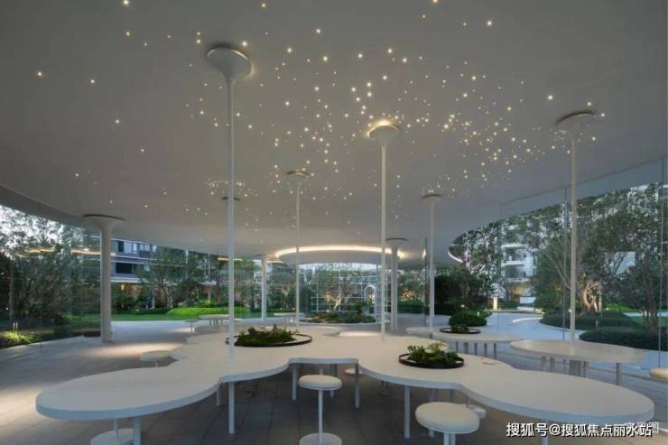 约2200㎡社区中央复合聚场会客厅:在社区核芯位置打造约2200㎡开放型会客厅,配置共享客厅、森林书吧、活动大艺术桌,以及台阶特色座椅、阳光草坪等,整个设计采用了简约时尚的风格,并以白色为主色调,迎合了年轻人的审美偏好。星空顶的设计更是为这个空间增添了一抹浪漫和时尚的氛围。是社区举办亲子生日会、露天电影派对、露营交友派对等大型邻里活动的核芯聚场,让年轻人互联无界,尽享生活。
