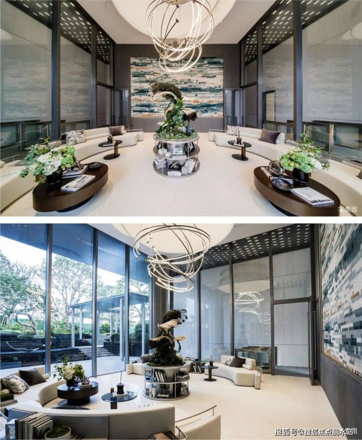江南首献社区大型室内星空顶会客厅,以超强未来感与艺术感,为业主定制交友的室内社交场域。汲取灵感自劳斯莱斯幻影的流星穹顶,我们营造出一个如梦似幻、银河般浪漫且充满仪式感的环境,天花造型取自玉兰花,寓意“高尚的品质”及“美好的未来”,背景墙设计灵感汲取广西地理山水文化, 用18880块手工陶瓷砖拼成一副数码山水画,会客厅前方巨幕落地玻璃,将社区“浮光水岸”三跌水景全景展示,意境浑然天成。这里不仅是业主会客接待的理想场所,也是静听水声、欣赏美景、沉思发呆的绝佳去处。