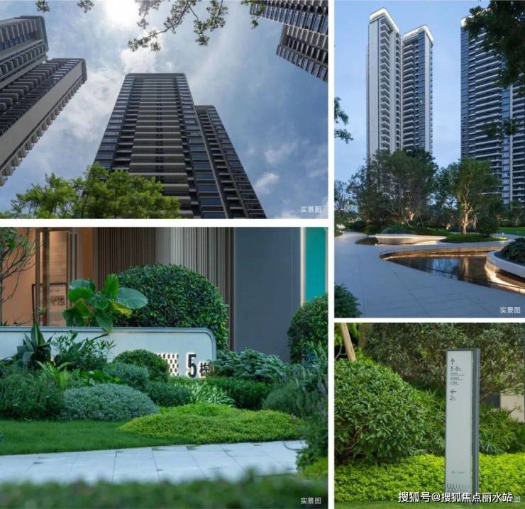 建筑立面呈现代极简风格,墙体的米白色与大面积LOW-E中空玻璃灰交融,色彩高级简约,阳台弧形元素与立面笔直竖向线条,勾勒出挺拔且清晰的建筑群,约4米高弧形玻璃塔冠,尽显豪宅气质,打造极具辨识度的城市天际的美学封面。社区内部公区,采用枪灰色、香槟金、润白为主色调搭配,导视系统、导向标识选用精致铝板、石材、不锈钢等材料,简约之中出细节,细节之中显品质,统一协调,又尽显高级;水景、地面、植被设计等采用大面积弧形线条设计, 营造意境美感。