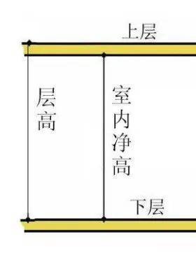 层高=室内净高+楼板厚度,净高=地板到天花板的距离。