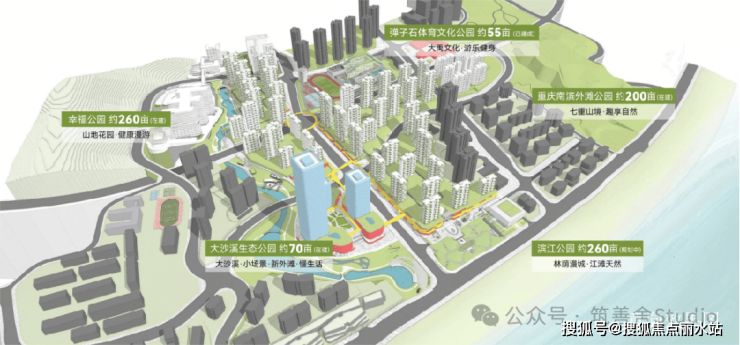 重庆南滨外滩公园(在建)、大沙溪生态公园(在建)、滨江公园(规划)、幸福公园(在建)、体育文化公园。