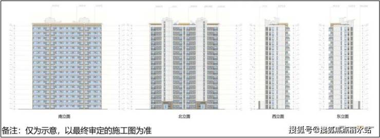 项目南立面为米白色/暖灰色/香槟色真石漆,北立面为米白色/暖灰色/香槟色真石漆、香槟色铝板、灰色石材,西立面为暖灰色真石漆、灰色石材,东立面为米白色/香槟色真石漆、香槟色铝板。