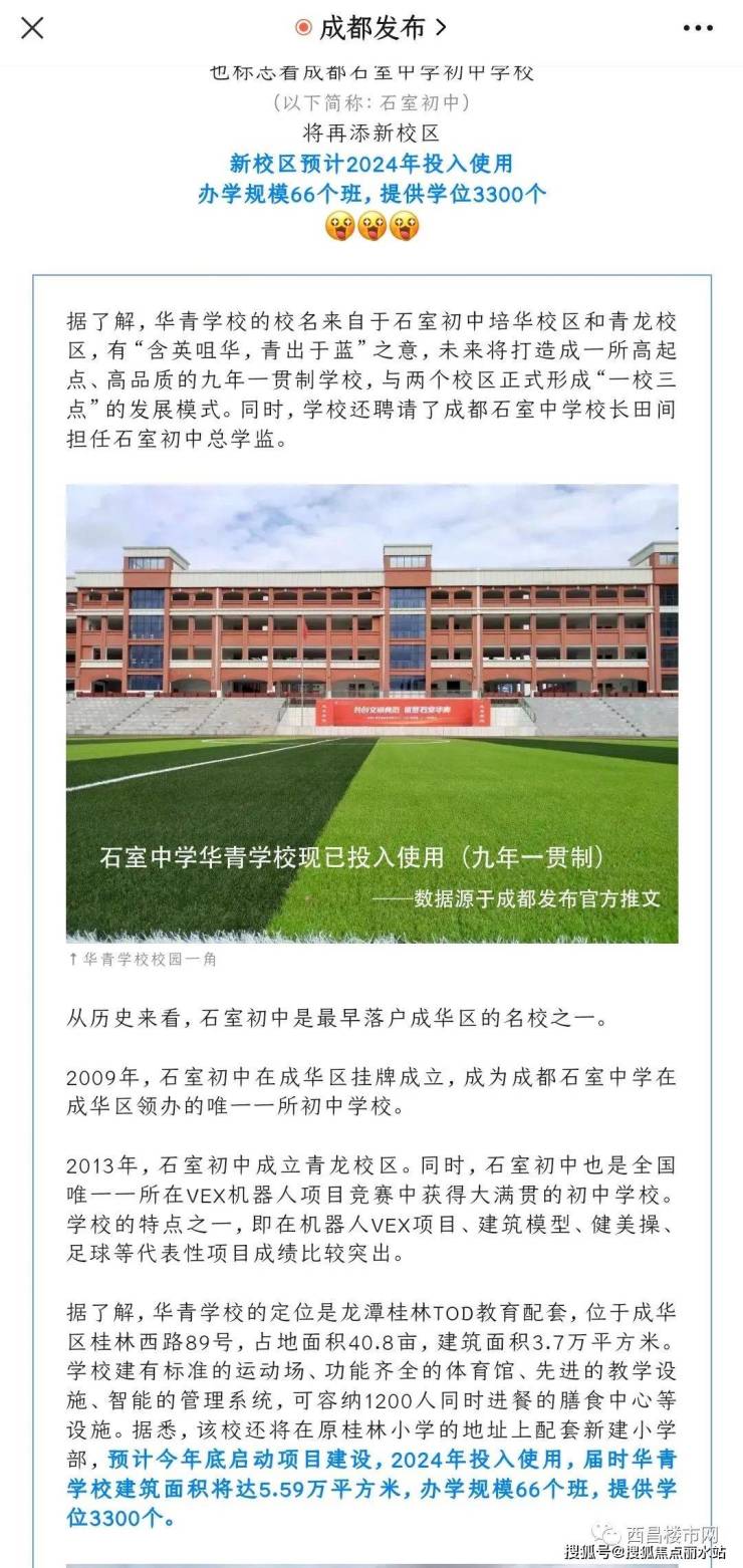 4.邻学校:邻公办石室中学华青学校,66个班,3000学位(现已投入使用),邻公办成都第三十幼儿园,9个班,容纳270名幼儿(招生中,9月正式开学)
