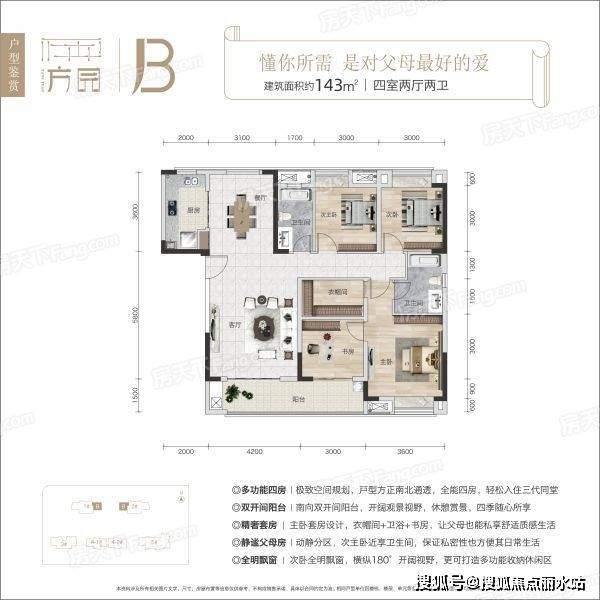 多功能四房户型,户型方正,三开间朝南。动静分区,居住舒适。双阳台设计,通风采光效果更好。主卧套房设计,带独立衣帽间、卫浴、书房,私密性很好。方园电话TEL:400-8787-098转接5555
