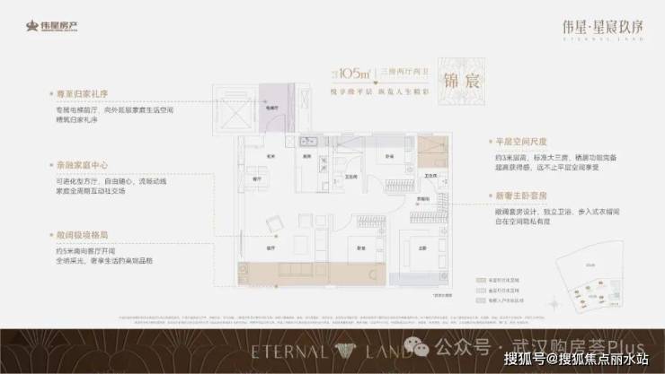 建面约105平,三房两卫,南向开间11.3米,客厅开间5米;双开门电梯,电梯前室可以独享;主卧卫生间的隔断被优化掉了,后期使用更方便。