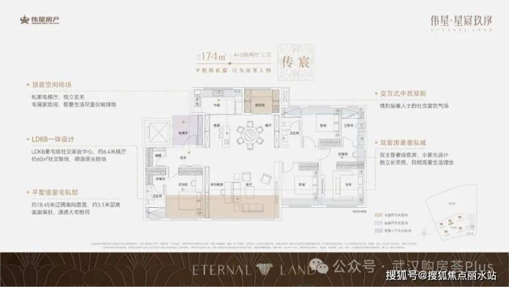 建面约174㎡,甚至做到了约18.45米南向极限面宽,而同级户型尺度仅约15.2米,这个尺度甚至比不上项目建面约143㎡户型。实现平墅级体验——约60㎡公区、家政间、储藏室、交互式中西双厨……顶奢空间排场一应俱全。