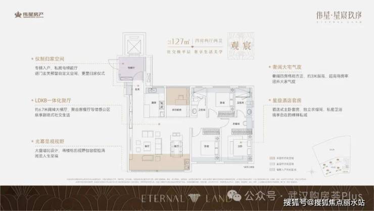 建面约127平,四房两卫,南向开间13.4米;客餐厅是大横厅,开间6.7米,采光更好;前期北向多功能房的隔断也被优化掉了,后期使用更方便;独立电梯,可独享电梯前室。