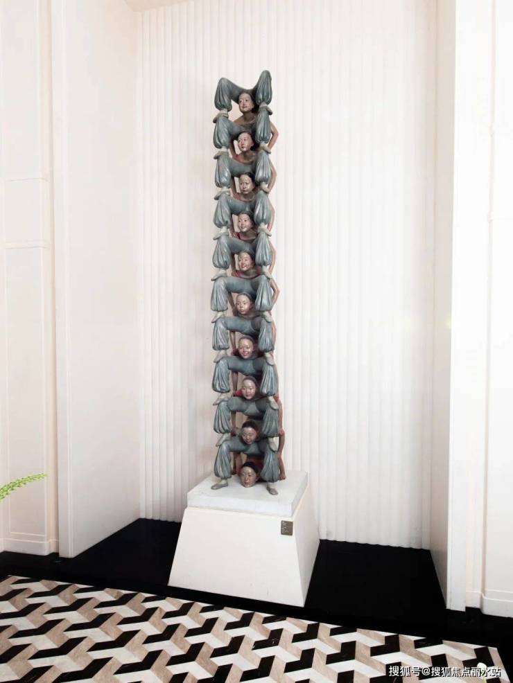 约12米挑高的首层大堂,被定制的整幅画作《群山微风》震撼装点;公区中还有顶奢酒店深圳柏悦酒店所陈列的同系列作品《无限柱》……