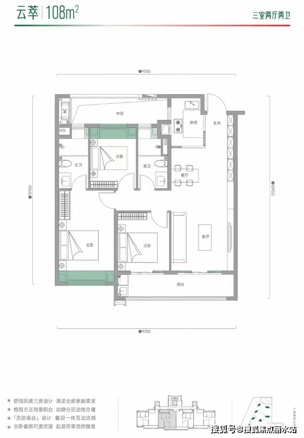 该户型位于连廊中间户,北边对连廊,可以达到南北通透的效果,但是北边对着连廊的空间私密性会有一定影响;该户型很方正,动静分区较好,主卧带有独立卫浴且南北贯通,舒适性不错。