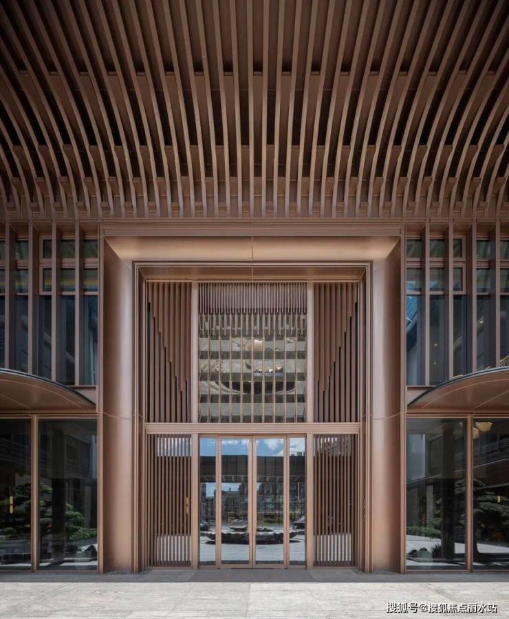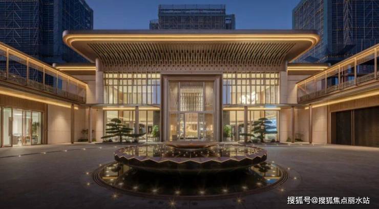 门厅礼序,华丽的装饰与大气的落客空间尺度打造酒店式空间,彰显尊贵与品质。豪宅美学界面,以金属装饰与石材彰显贵气,门楼两侧的迎客松以浩然之姿,恭迎四方宾客。水景形态来源于佛教象征宝相花瓣纹,寓意步步生莲,同时圆形又寓意聚宝盆。