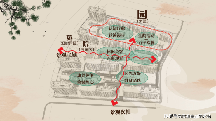 一环: 健康跑道;两轴: 主入口景观轴、次入口景观轴;五景:休闲会客-西窗观景,康养休闲-修髓练心,睦邻友好-群贤品谈,认知疗愈-花溪漫步,全龄活动-百子欢腾。