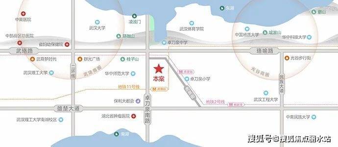 武汉发展主轴,城市文脉轴心:择址武汉城市中轴线上,武珞一路串联城市繁华中心与顶配资源,踞武昌城市发展主轴与东湖生态主轴交汇的城市文脉十字轴心。