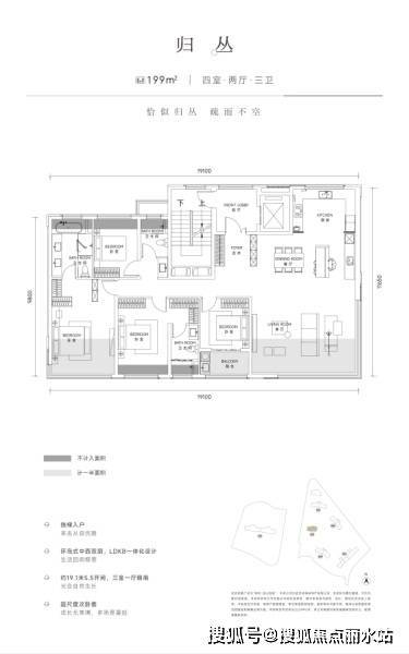 197㎡户型,四房两厅三卫,双套房设计;南向面宽高达19.1米,四面采光通风,通透性极佳;阳台进深约2.4米,双阳台加上多个飘窗,优化后得房率约95%,如果加上电梯前室的面积,得房率也可以做到接近99%。