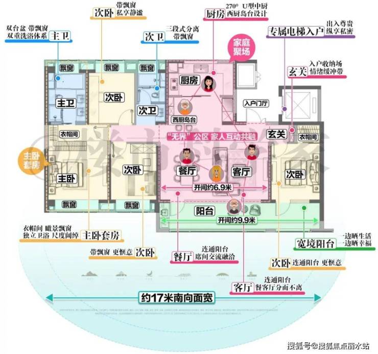 建面约172㎡四房两卫,南向观景面宽约17米,开间约6.9米的餐客厅,与开间约9.9米的贯通式阳台相连,进一步打开气场。南向双套房设计,私域更尊贵。全屋5大飘窗,生活少不了这些边边角角的滋润。