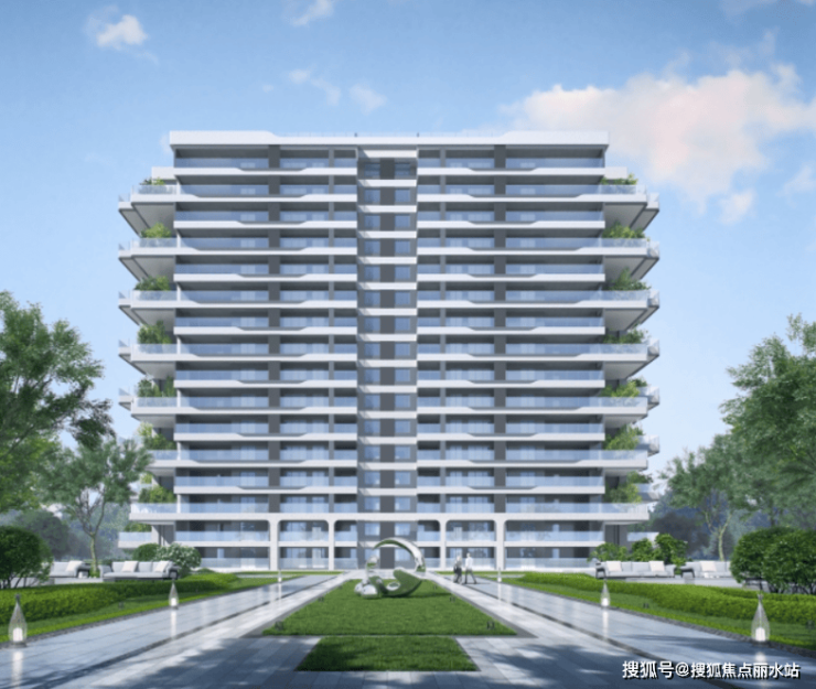 从远处看去,整个楼盘极具辨识度,空中花园与大面积玻璃栏板的组合,均体现出建筑的现代、精致和新锐。