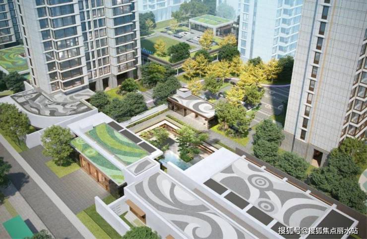 即在社区大堂屋顶、车行入口屋顶以及会所屋顶等地方,通过绿植植栽、灰色砾石组合铺排,打造梵高《星空》艺术般的视觉美学。