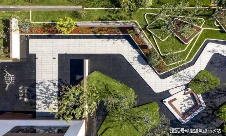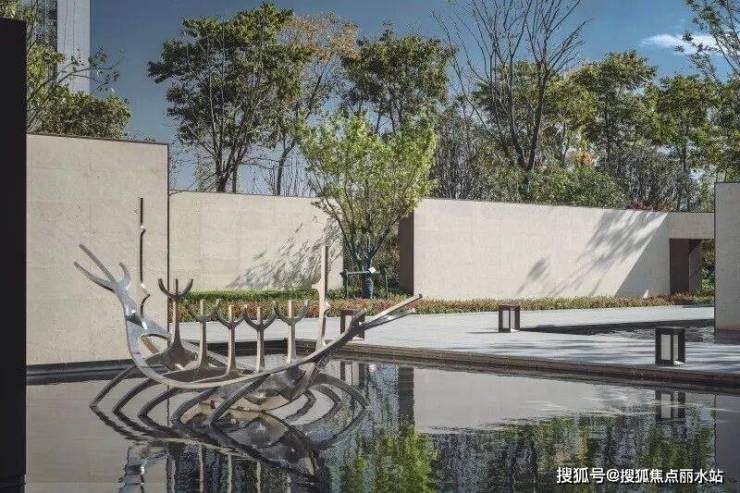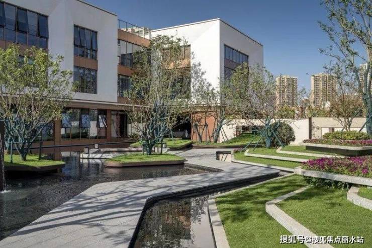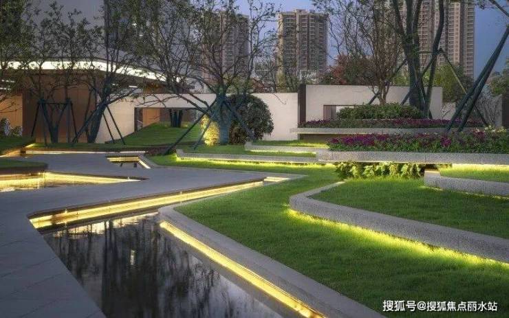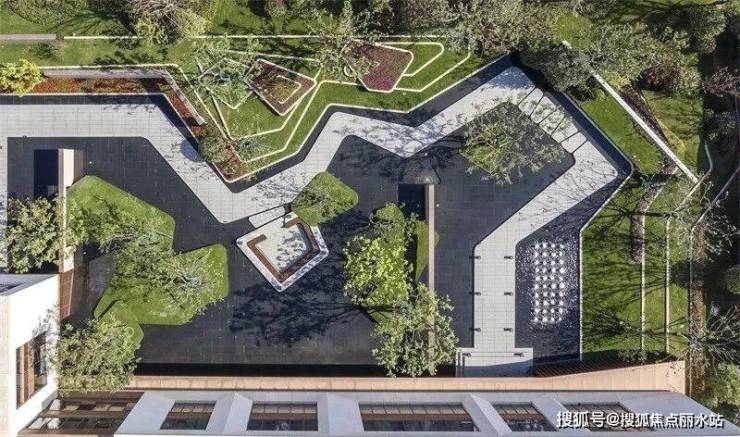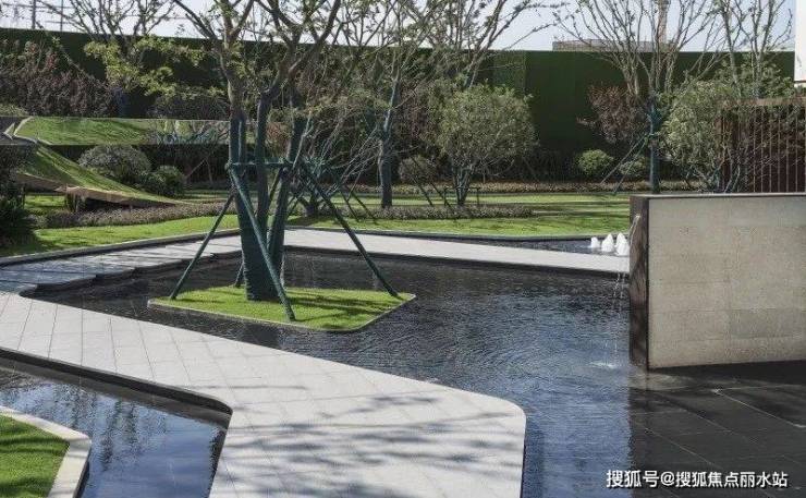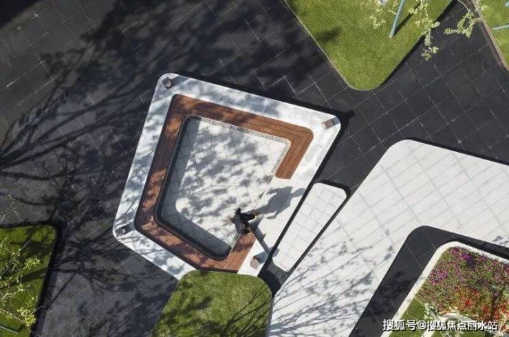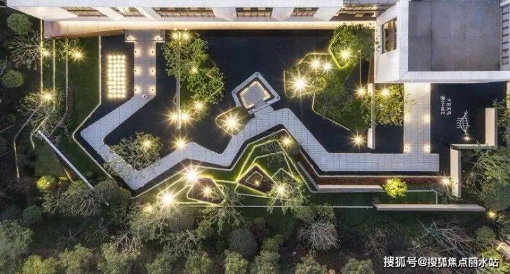 借鉴抽象艺术大师康定斯基的解构主义手法,将平面上的部分空间进行竖向上的解构设计,打造绿化折板水幕,就如同江水带给人的感觉,有静亦有动。水的灵动托起了整个片区的生气。