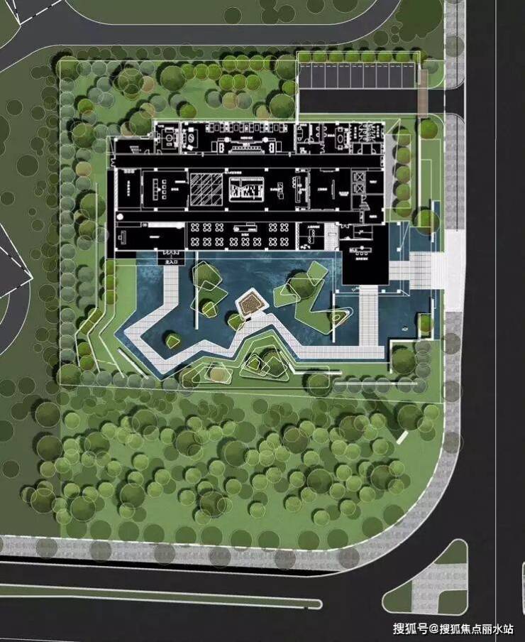 采用穿插关系将竖向和场地平面上的关系进行串联,打造出江中绿岛的场景。