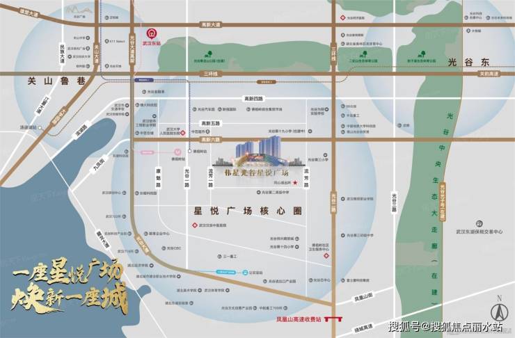 伟星·光谷星悦广场位于东湖高新区高新六路与流芳一路交叉口,属于光谷南板块.位于武汉三环外约3.2公里,环线位置中规中矩,周边发展较为成熟。北边是高新六路、佛祖岭地铁车辆段、武大人民医院光谷院区:东边是流芳路、光谷三小、佛祖岭F区等小区、京广高铁等:南边是牌楼舒路、光谷二中、富士康青年公寓、美的云筑小区:西边是流芳一路、佛祖岭社区、佛祖岭地铁站等。