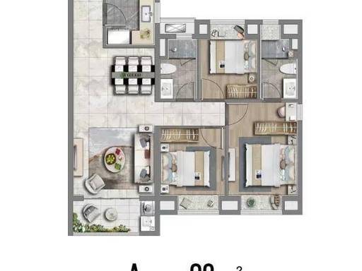 大名城映辰深耕刚需与刚改家庭需求,打造建面约 98-124㎡全周期精装户型,涵盖三房、四房两大品类,所有户型均采用方正格局、南北通透设计,得房率高达 80%,空间利用率远超同板块竞品,满足从三口之家到二胎家庭、三代同堂的全周期居住需求。