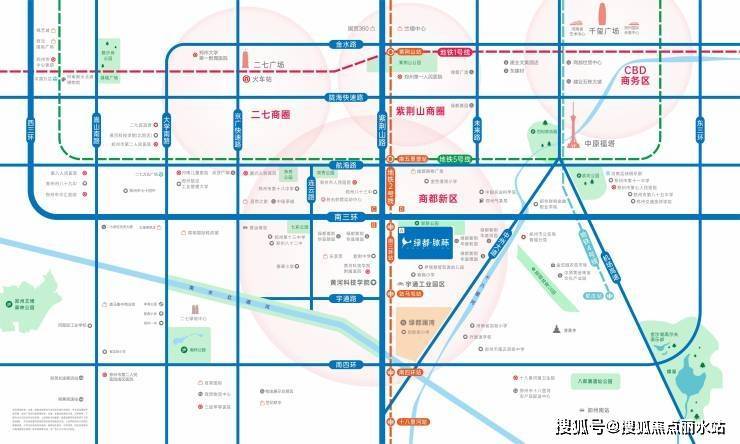南三环与紫荆山南路中轴,北接紫荆山芯,西邻二七,东近滨河新城,南拓航空港区,聚焦交通枢纽、商业旗舰、醇熟社区,构筑主城繁华