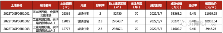 2022年5月7日保利置业以10.02亿元摘得正丰路西侧地块、崇华路西侧A1、A2地块共计3宗(A2地块为租赁住房),溢价率9%;其中可售住宅地块总占地3.8万㎡,地上总建面8.1万㎡,住宅平均楼面地价11029元/㎡。