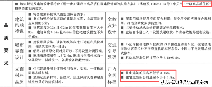 住宅建筑外墙主体应使用石材、铝板、一体板或同等品质材料,住宅建筑的层高不低于3.15m,住宅主要阳台进深不小于1.8m。