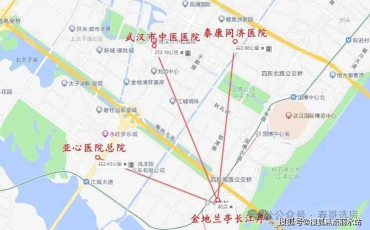 项目最近的是亚心医院总院,附近还有武汉市中医院和泰康同济医院,直线距离都在3公里内,过白沙洲大桥就是洪山区的人民医院和省妇幼洪山分院。