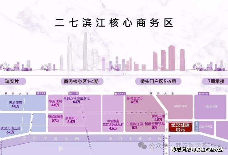 武汉城建启元位于二七滨江六期,二环外,但是紧邻二环线,项目共分两期开发建设,一期涵盖住宅、商务办公、滨水商业街等多元业态;南向一线瞰江,行列式布局、打造户户瞰江准四代住宅。