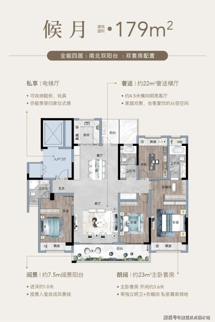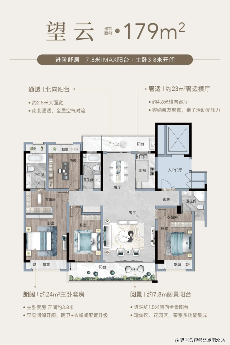 除了218㎡户型外,梧桐锦上首开还将推出建面约179㎡户型,两款户型虽布局略有不同,都是四房两厅三卫、双套房的设计,亮点颇多。