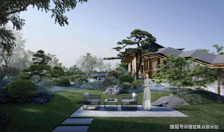 二进山水庭院,临摹宋画千卷,打造廊桥与水榭围合而成的庭院,庭院内种植着不同类别的树木植被,将宋韵风雅与梧桐锦上的地形完美交融,尽显雅致意境。