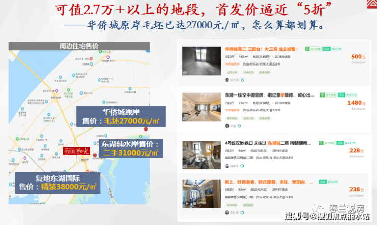 9、 逼近住宅5折价:华侨城原岸毛坯27000元/㎡,周边二手房均价超31000元/㎡,项目首发价逼近周边住宅价5折,怎么算都划算。