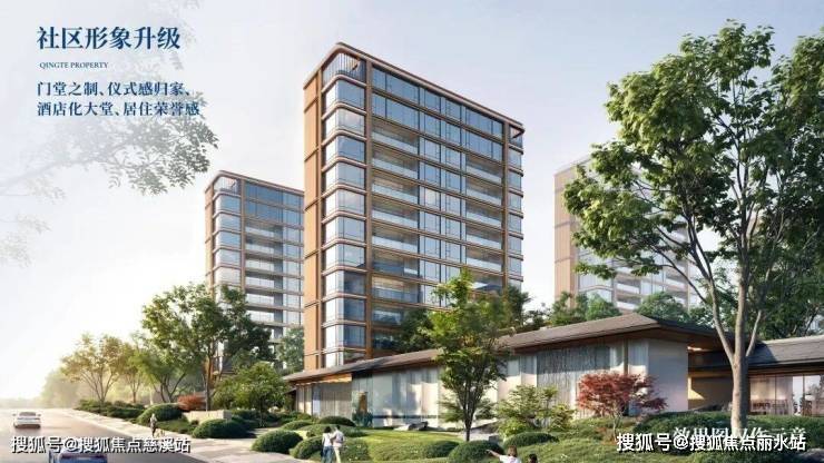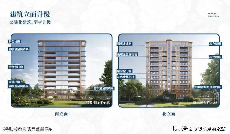 建筑立面采用南向铝板+LOW-E玻璃,搭配香槟金色金属线条,整体轻盈现代,充满镜面艺术感。