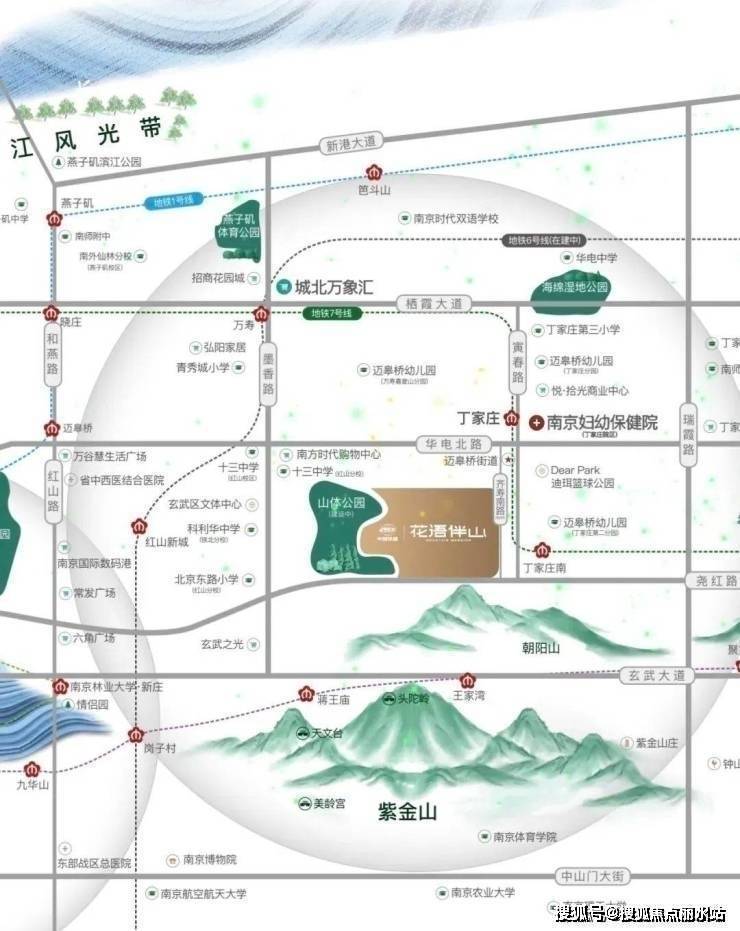 生态休闲:楼盘周边生态环境优越,周边 3km 范围内有 16 个公园,距离最近的仅 1.1km。项目周边自然景观资源丰富,毗邻山体公园、紫金山、聚宝山公园、玄武湖、红山动物园13。