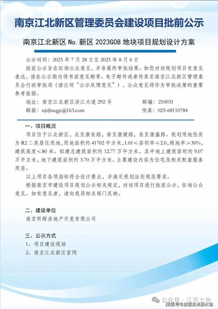 NO.新区2023G08项目用地面积约41702㎡,容积2.0,建筑限高80米。该地块于2023年9月27日,由南京昕科资管(江北新区科技投资集团)以15亿元底价竞得,成交楼面价17984元/㎡,金地管理联合金地商置东部区域代建开发。