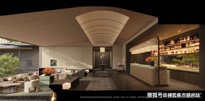 建筑呈现精致的现代东方美学仪态,突出金属与石材的对比,自然与人工的交织,精致与粗粝的结合。自然面石材线条自下而上逐级变细,把自然带到空中。高级浅坡飞檐元素设计,则勾勒出一种极简的飘逸东方之美。从额枋–石材额枋,到屏风–金属网帘,从栏杆–寻杖勾栏,到配色–璞石鎏金,处处彰显着设计的精湛和手工感的细节之美,以精雕玉琢敬呈国际东方形神气韵。