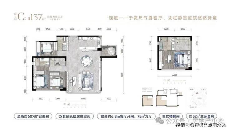 ·137㎡跃层加赠送面积实得213㎡ 大方厅四房二厅三卫(可做5室)全落地窗设计