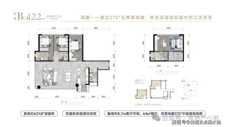 ·122-126㎡跃层加赠送面积实得196㎡ 横厅四房二厅三卫(可做5室)客厅拥有270度采光视野 nice