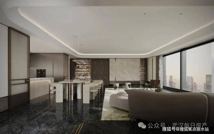 Ultra版环幕客厅,面向江景与中庭处,采用无界转角270度全景舱设计,拥有极致景观视野。