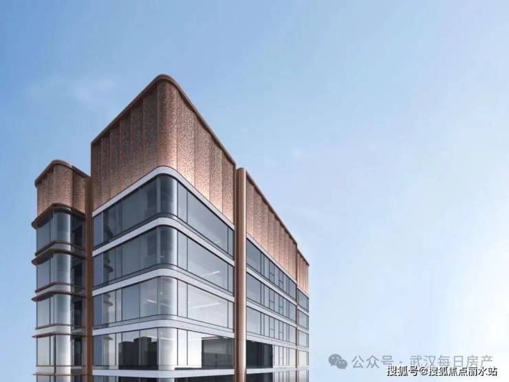 项目的建筑立面是非常有辨识度的,整体采用“鎏金冠冕”公建化设计,造型灵感来源于黄鹤楼的飞檐和长江的风帆。